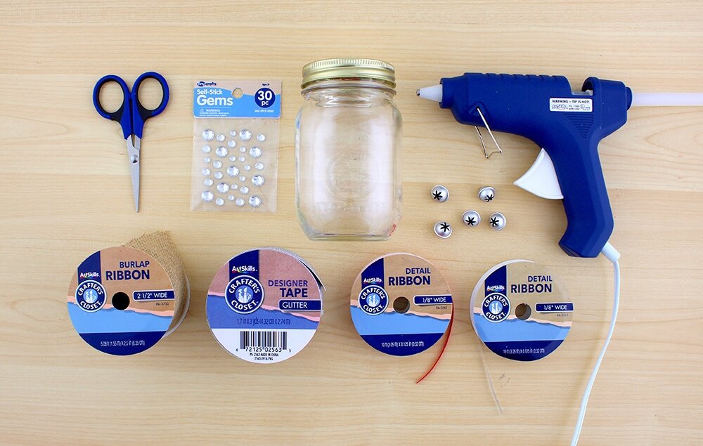 Remove the outer ring from a mason jar lip and wrap it with silver ribbon. Next, wrap the ring with red ribbon to create a candy cane pattern.