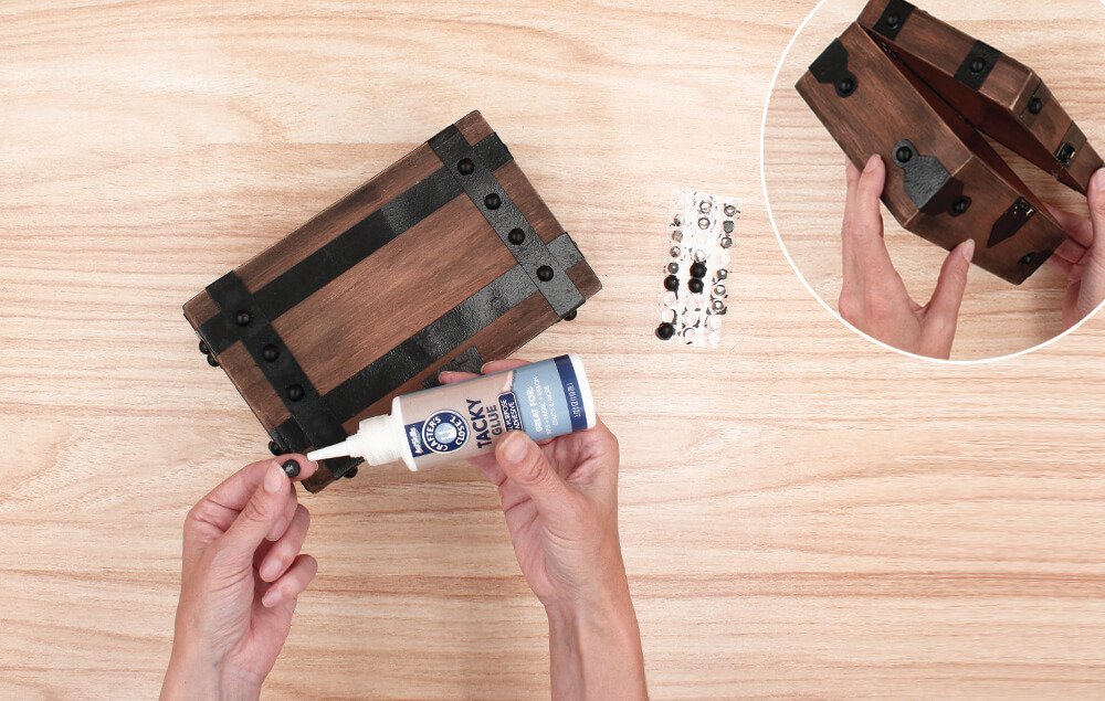 Glue the black-painted pearls onto the straps and brackets. Evenly space the pearls on the lid straps and place a pearl on the rounded area of each buckle.