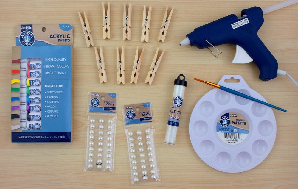 On the right side of each clothespin pair, glue a pearl ball to the lower clothespin notch.