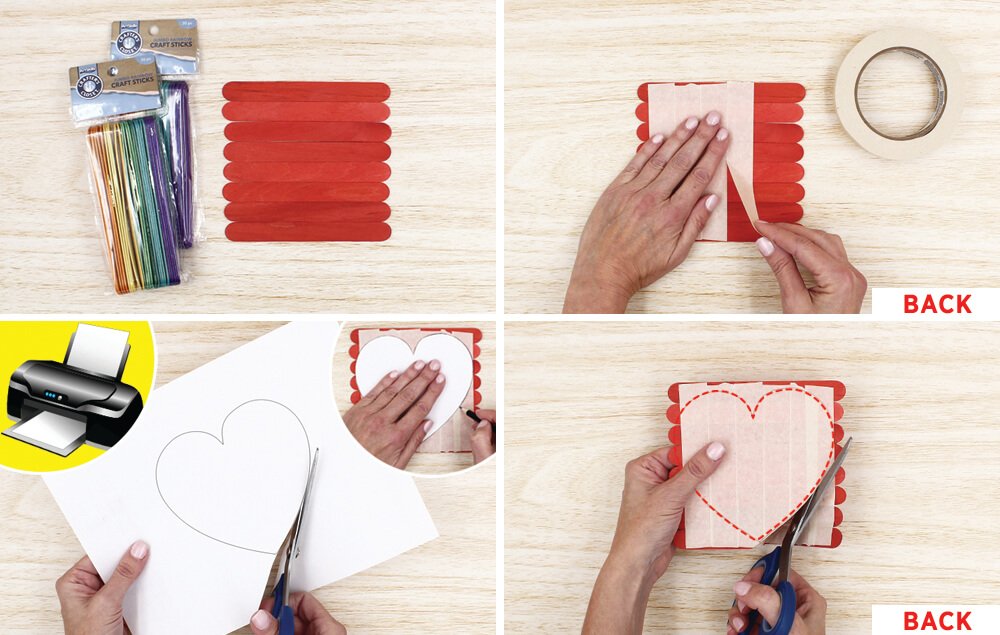 Cover the craft sticks with masking tape. Run the masking tape strips in the opposite direction of the craft sticks. Note: This will be the back of the heart.