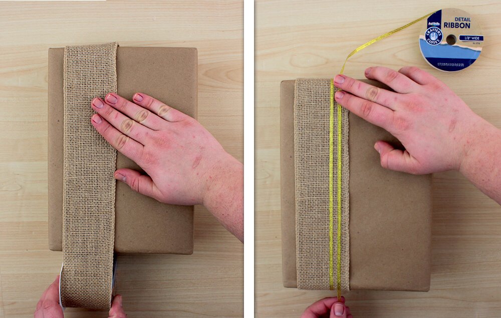Add a strip of burlap to the left side of your wrapped present. Tape The ends together on the back of the package.