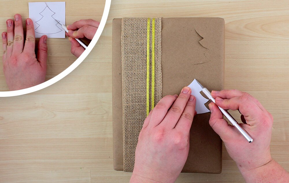 On the right side of your present, cut around just the right half of your tree template. Be careful so that you just cut the craft paper and do not cut into the glitter duct tape underneath. Repeat this for the desired number of trees. We cut out three tree shapes on our gift.