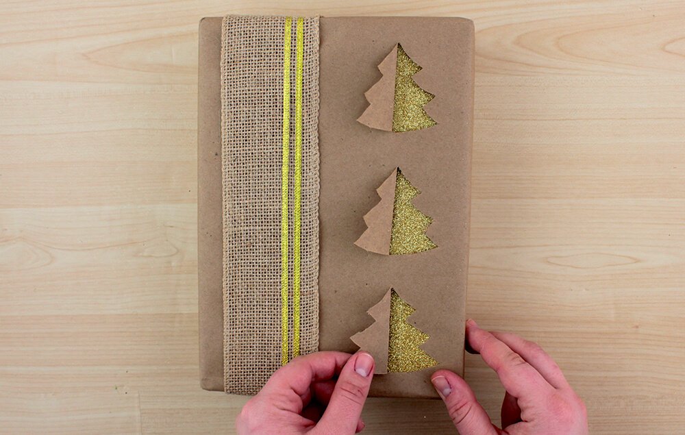 Fold out each cutout and press down to reveal each glittery tree along your wrapping.