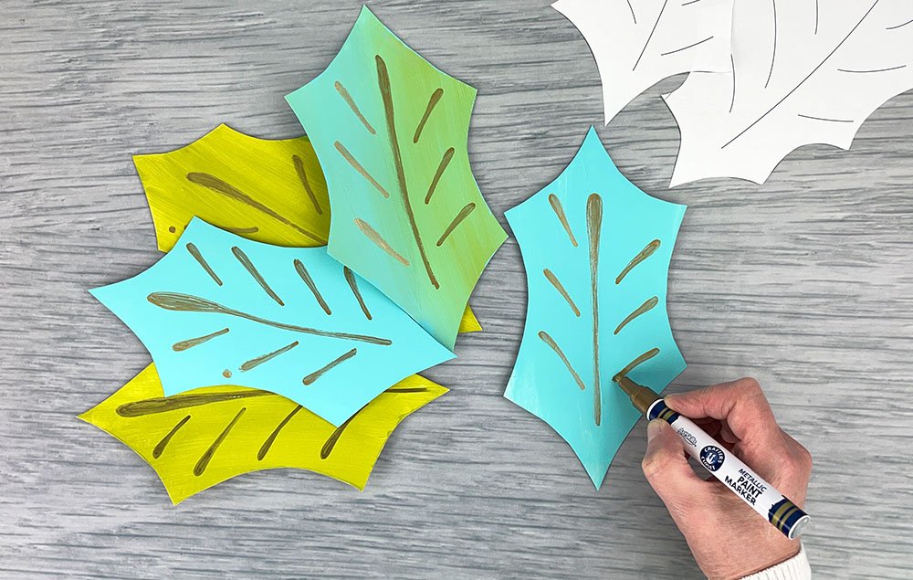 Create a retro-inspired holly garland crafted from oversized poster board leaves. Interspersed with vibrant red wooden beads for berries, this large-scale garland adds a touch of vintage charm to your holiday décor.