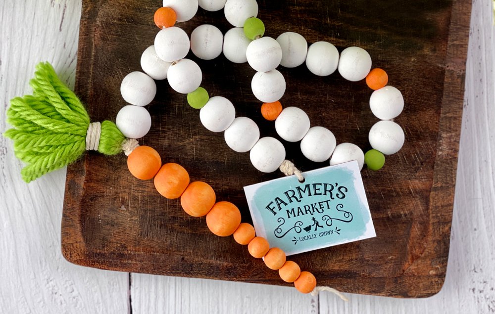 Craft an adorable carrot garland for spring! Orange-painted wood beads and a green yarn tassel create the fun carrot. Bright beads and a Farmer’s Market tag accent finish off the garland.