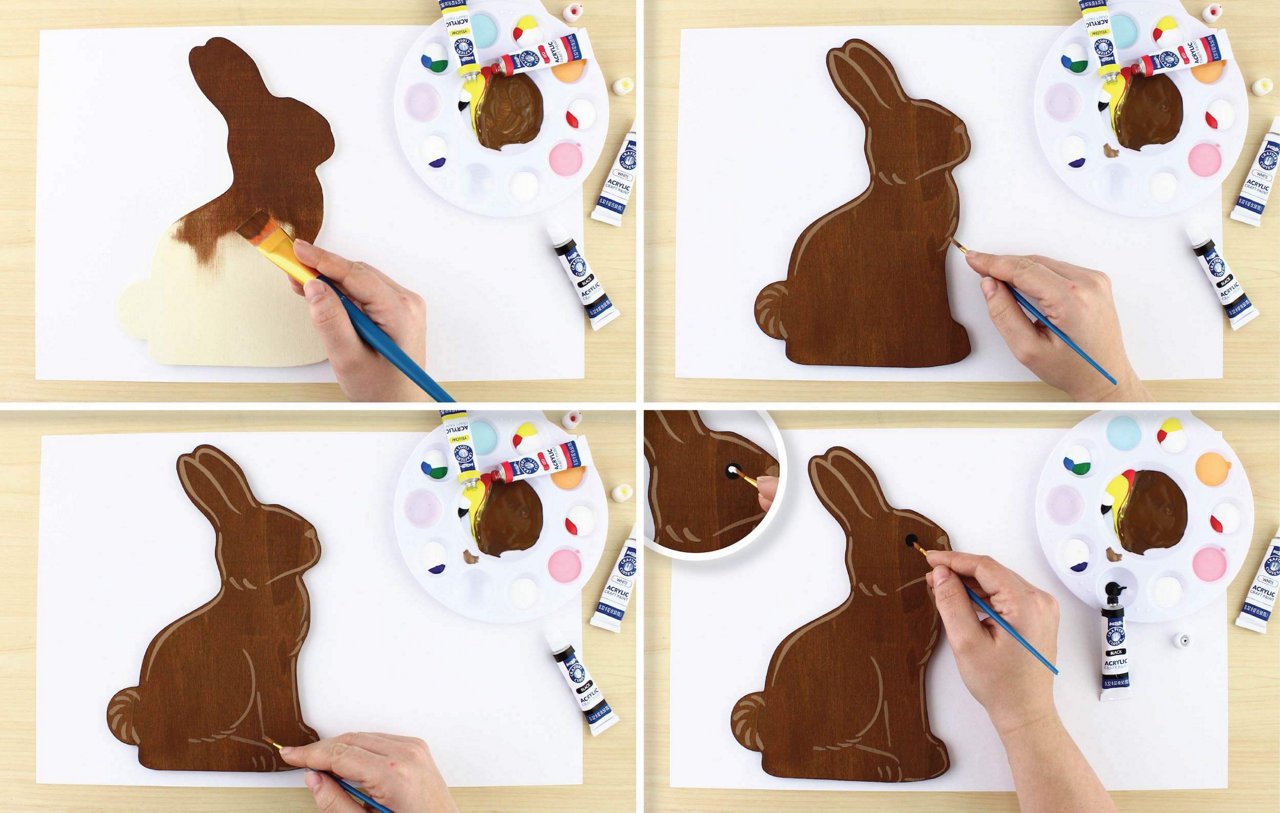 Adding a little more white paint to your brown, lighten it enough to show up on top of the original brown color. Add some thin lines surrounding the shape to create a ‘chocolate bunny’ look.