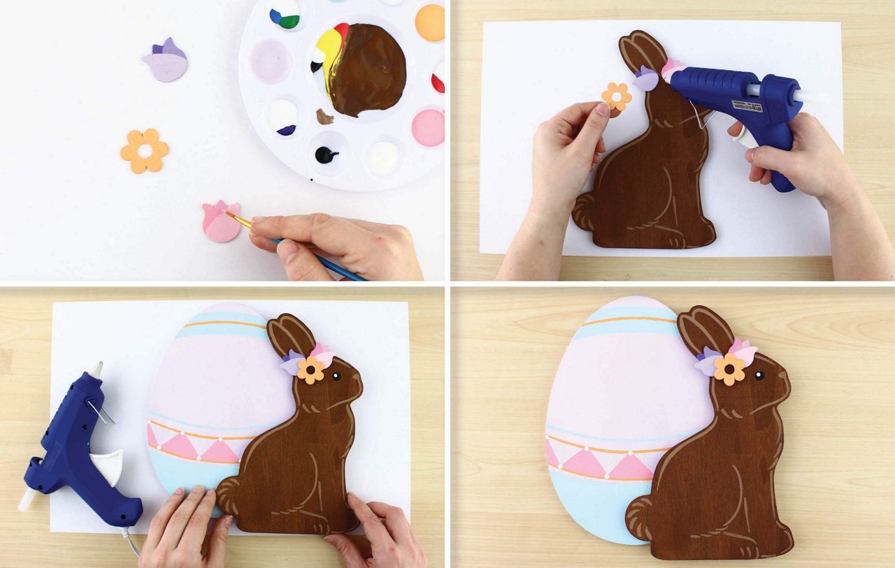 Hot Glue your flowers to the Wooden Bunny Plaque at the base of the ears.