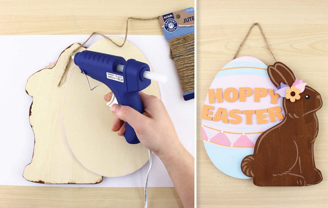 Hot Glue the Wooden Bunny Plaque to the Wooden Easter Egg Plaque. Use the Downloadable Template for proper positioning.
