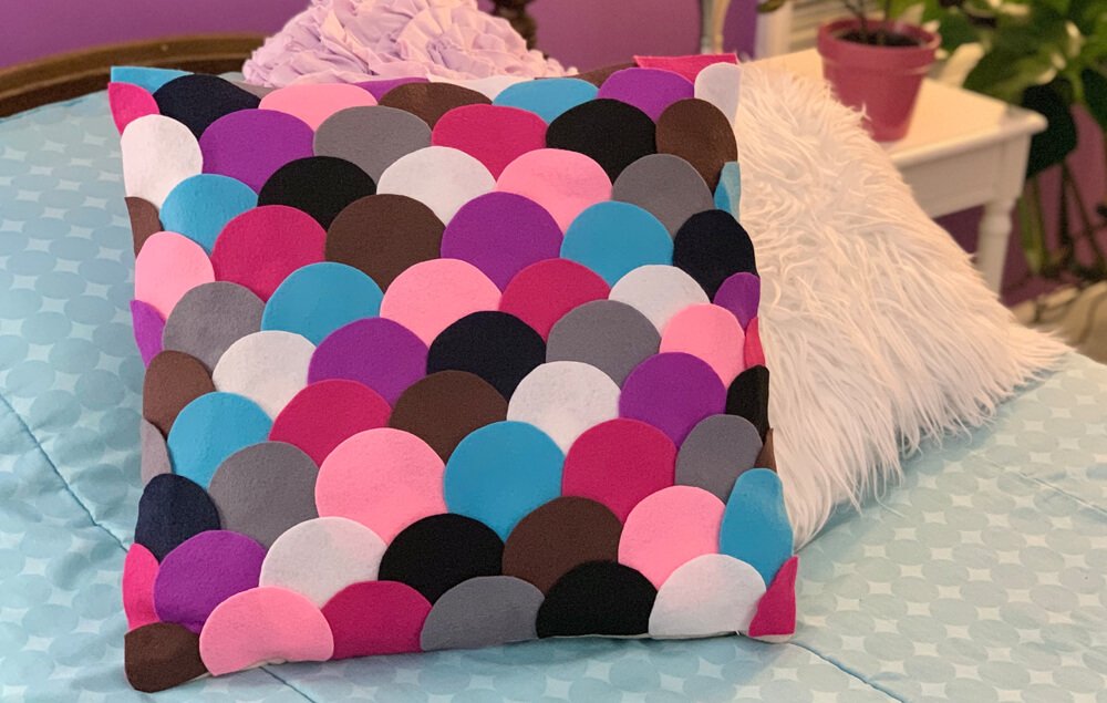 Make a no-sew scalloped felt pillow to add a fun pop of color to your home! Choose your favorite felt colors and customize the pillow to match your room’s decor.