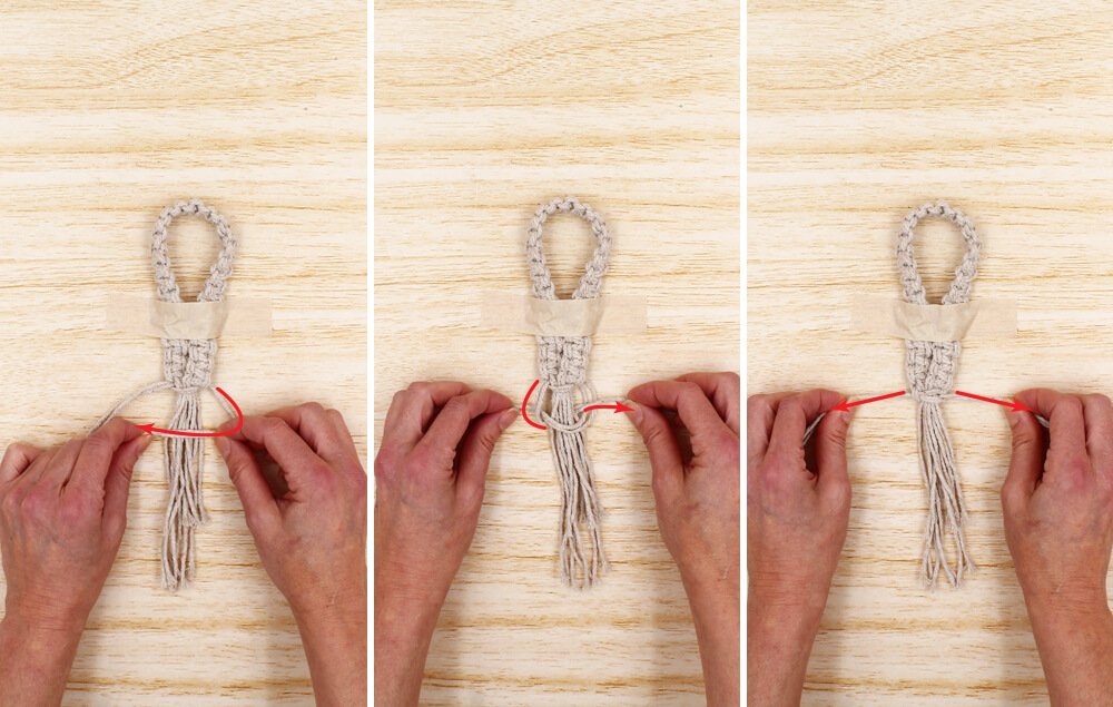 B) Grab a second cord and tie a knot underneath. Note: This will secure all the loose cords together.