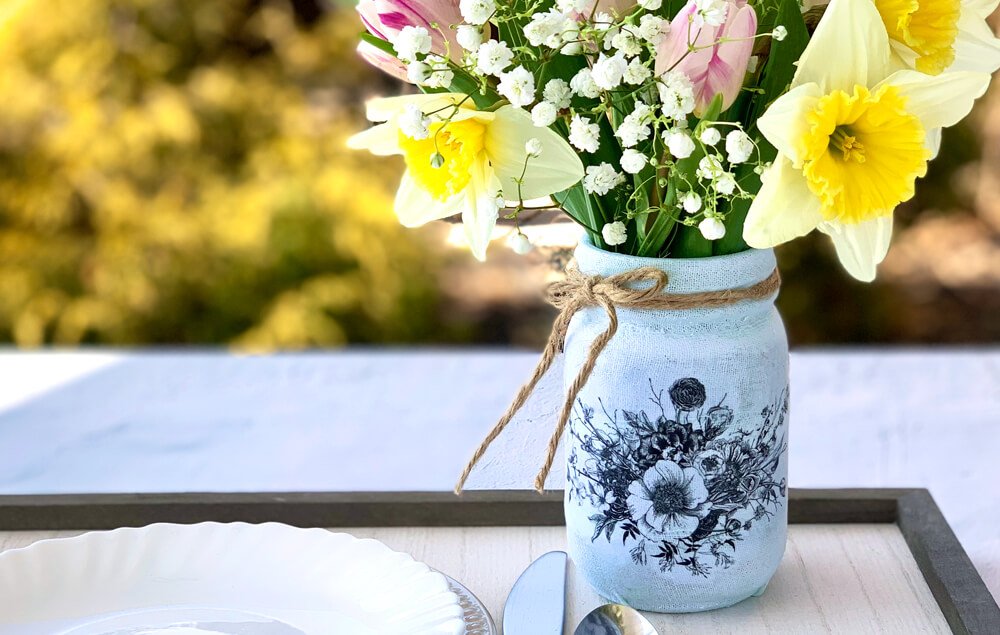Display a pretty bouquet of flowers in this beautiful spring mason jar vase! Who knew such a common jar could make such a big impact?