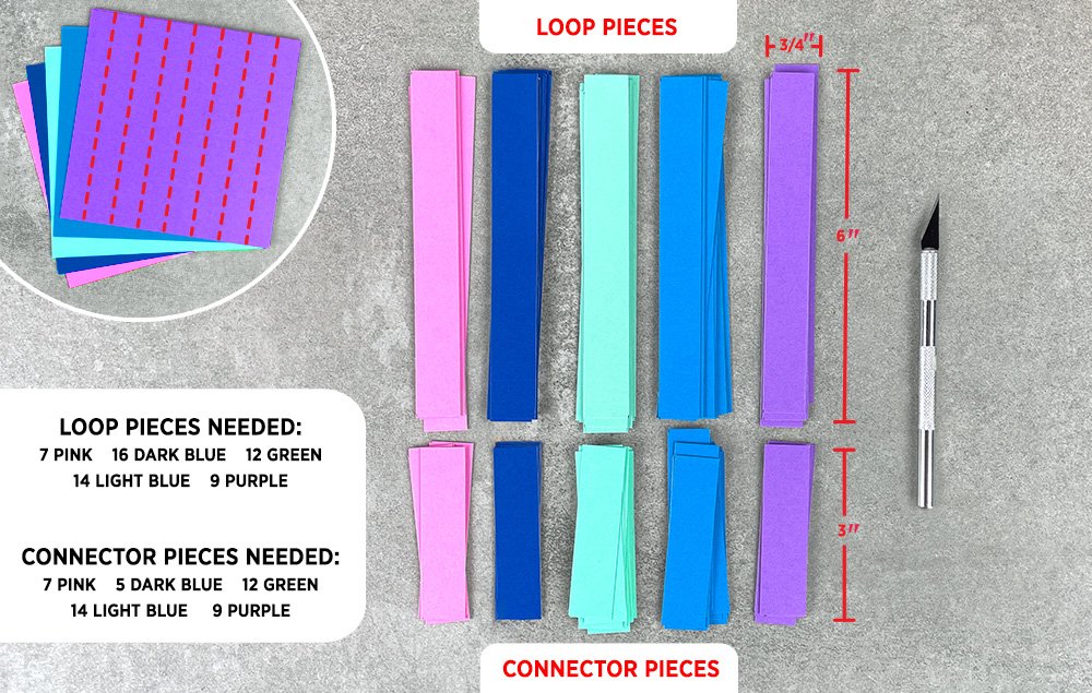 A) Follow the color pattern on the template to gather the loops needed to make the first strand. Note: Connector pieces should be the color of the top loop.