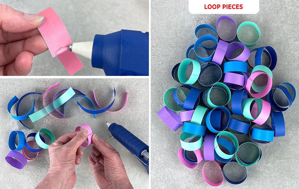 A) Hot glue all the 3/4" x 6" loops so they are completed and ready to use. Tip: Keep the seam overlap the same when gluing so the finished loops are uniform in size.