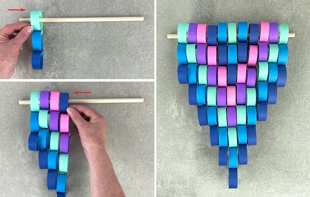 B) Continue making strands and sliding them onto the wood dowel, using the template as a guide for color placement.