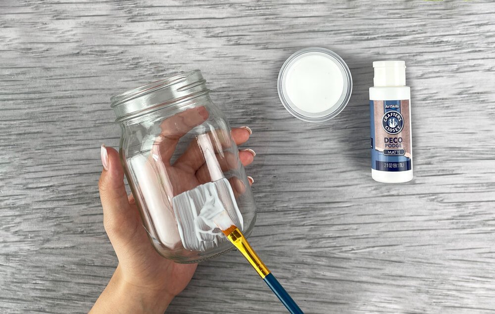 A) Apply a final coat of deco podge over the whole jar. Make up and down strokes on the body of the jar and follow the rings around the neck of the jar. Let dry.
