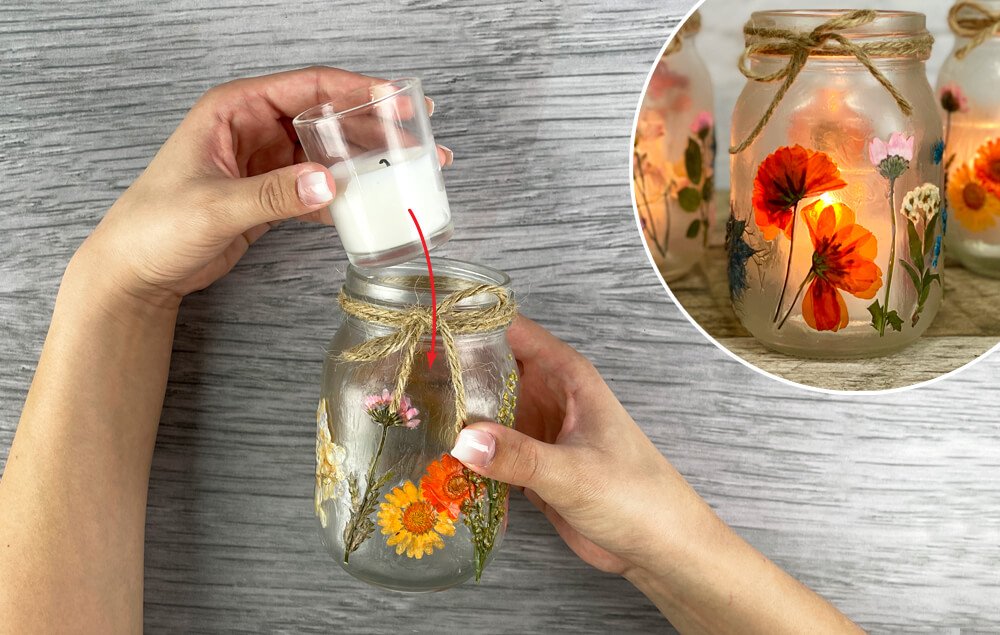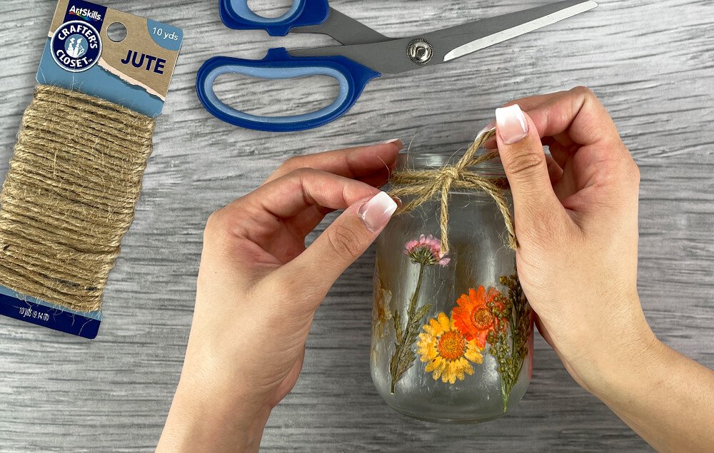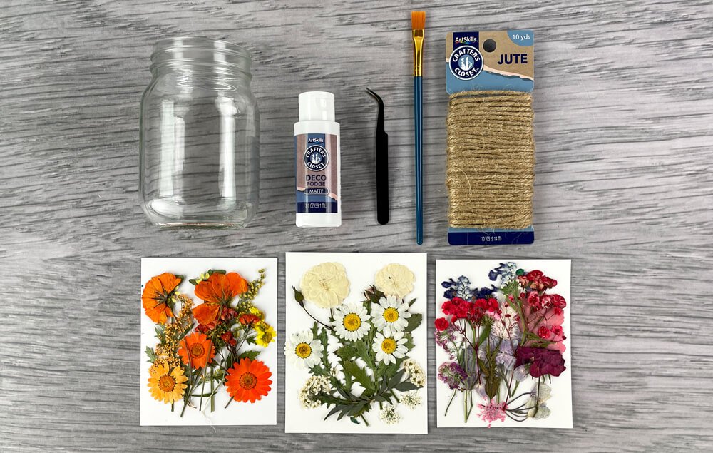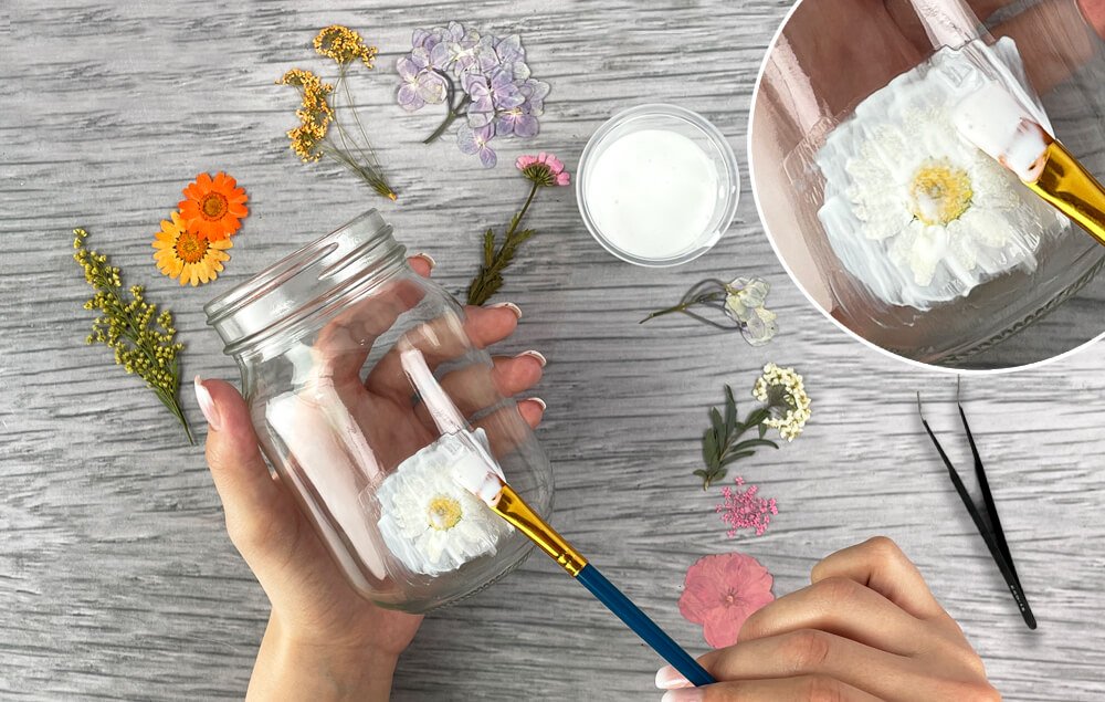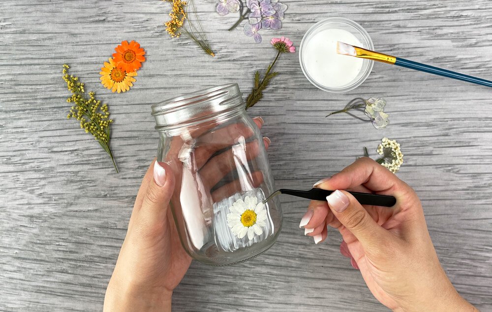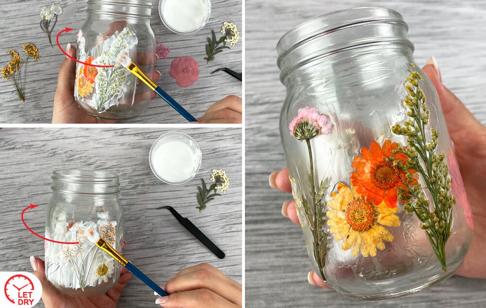 A) Continue applying deco podge and pressed flowers to the jar until you create the design you’d like. Let dry.