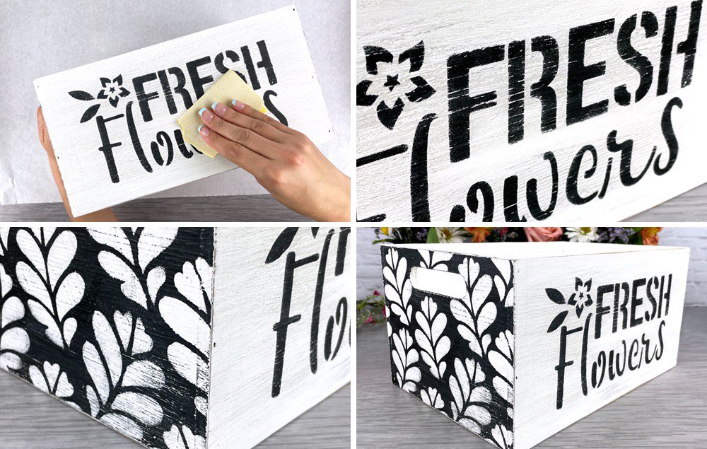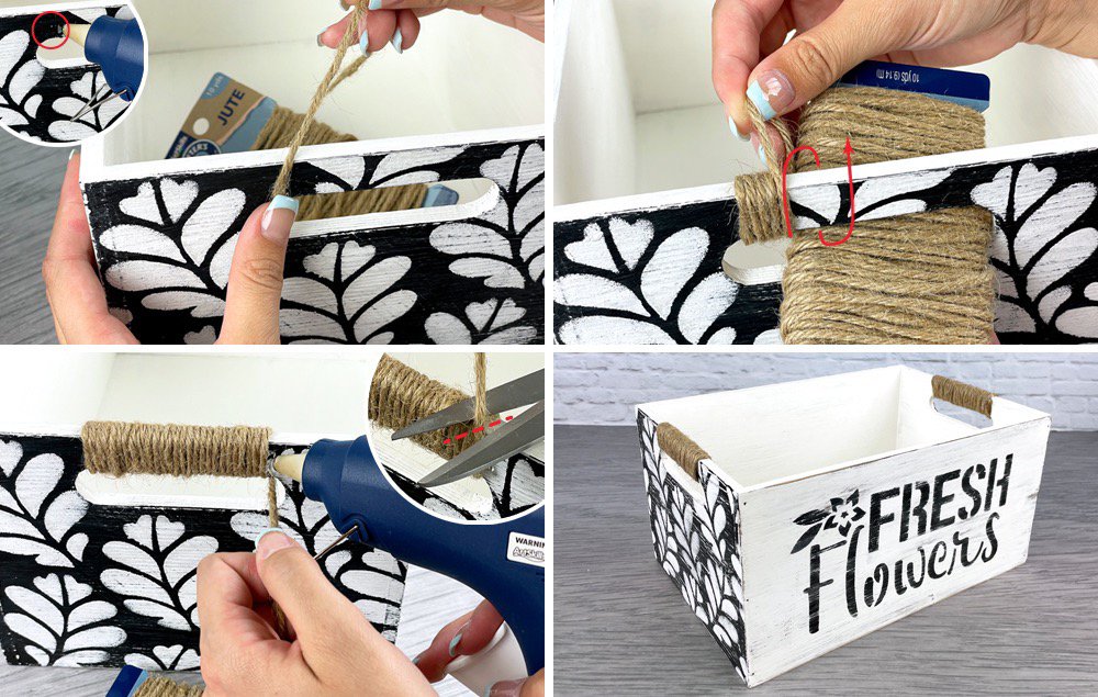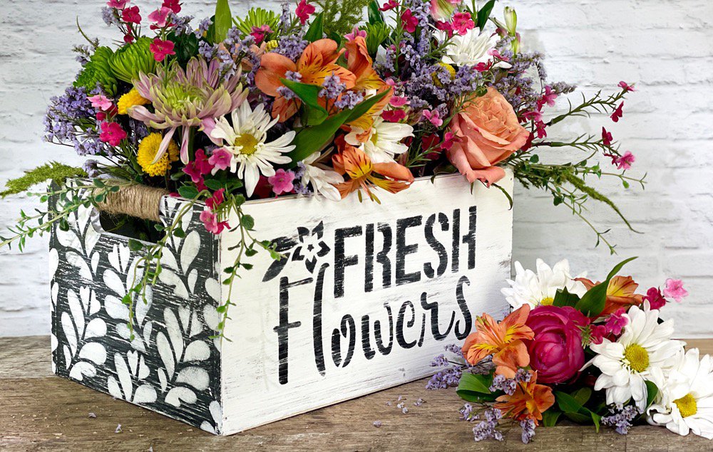 This rustic wood crate is a charming addition to any home decor. With its cut-out handles wrapped in jute, it’s easy to move from room to room. The crate is painted with a distressed finish and stenciled with the words “fresh flowers” and a lovely pattern on each side, making it perfect for any room in your home. Fill it with a DIY flower arrangement and enjoy!