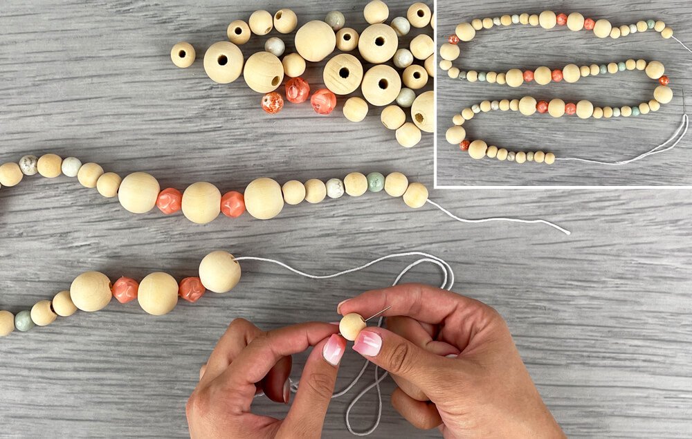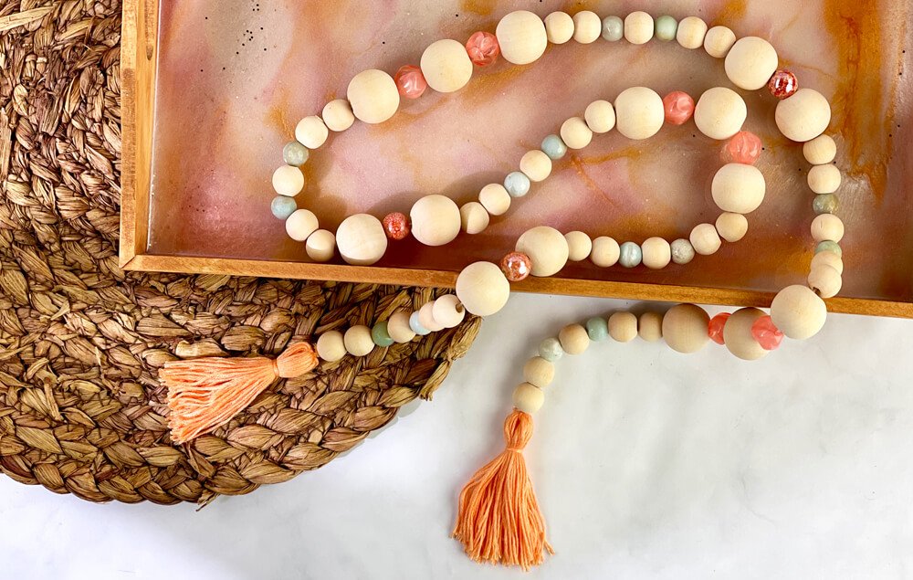 This DIY natural wood bead garland is a perfect finishing decor piece for your home! Add accent beads and tassels in your favorite colors to complement your summer decor.