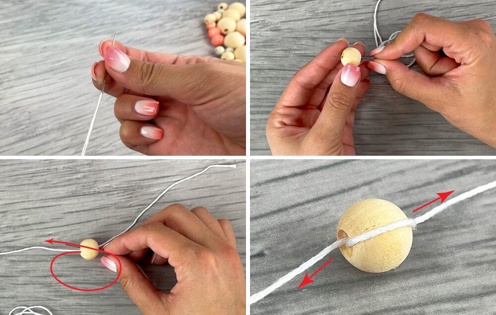 B) Insert the needle through the first bead. Slide the bead along the embroidery floss until you almost reach the other end. Leave a few inches at the end.