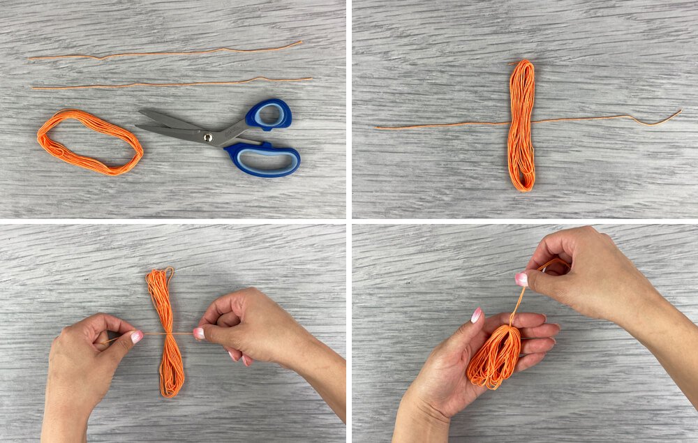 A) Choose an embroidery floss skein color to make a tassel. Carefully cut two 10" strings from the skein.