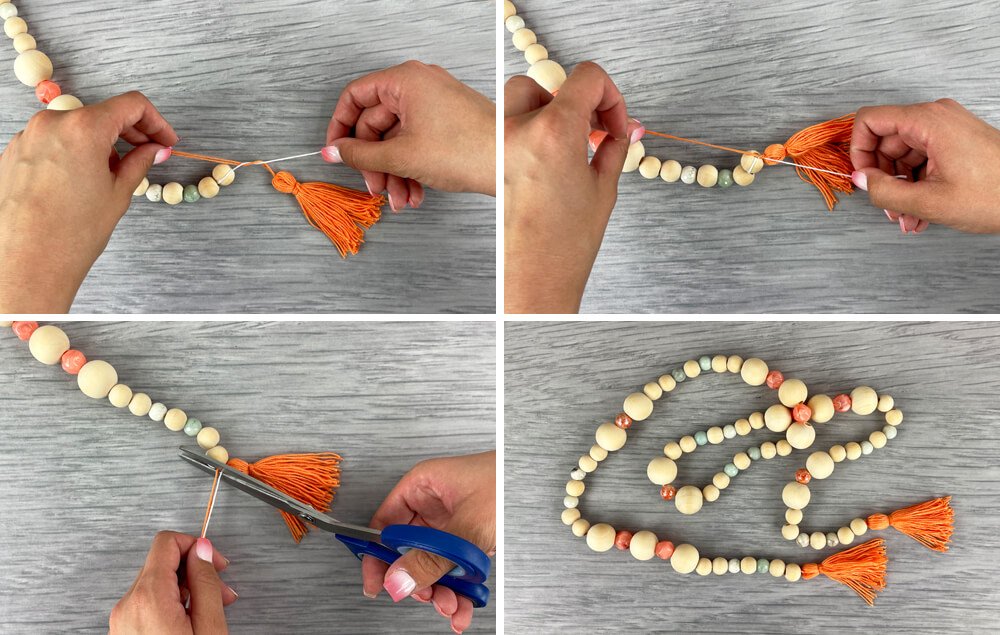 A) Attach a tassel to one end of the garland by tying the excess string at the end of the garland to the string at the top of the tassel.