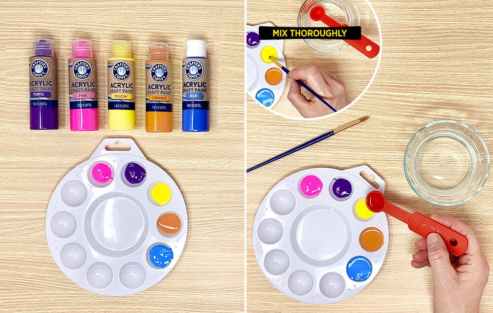Add ½ tsp. of water to each color well. Mix the color/water mixture thoroughly.