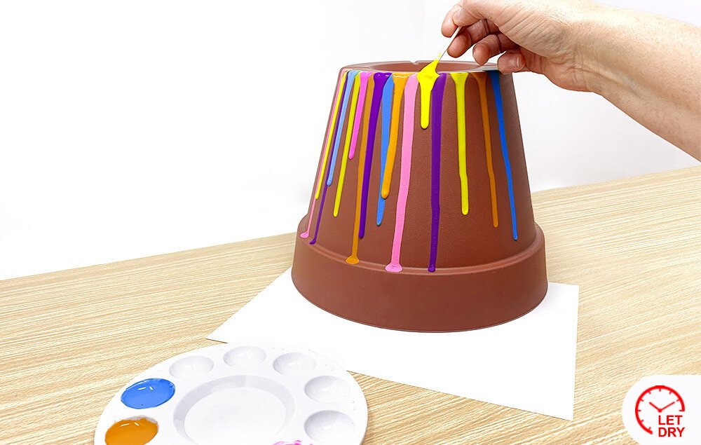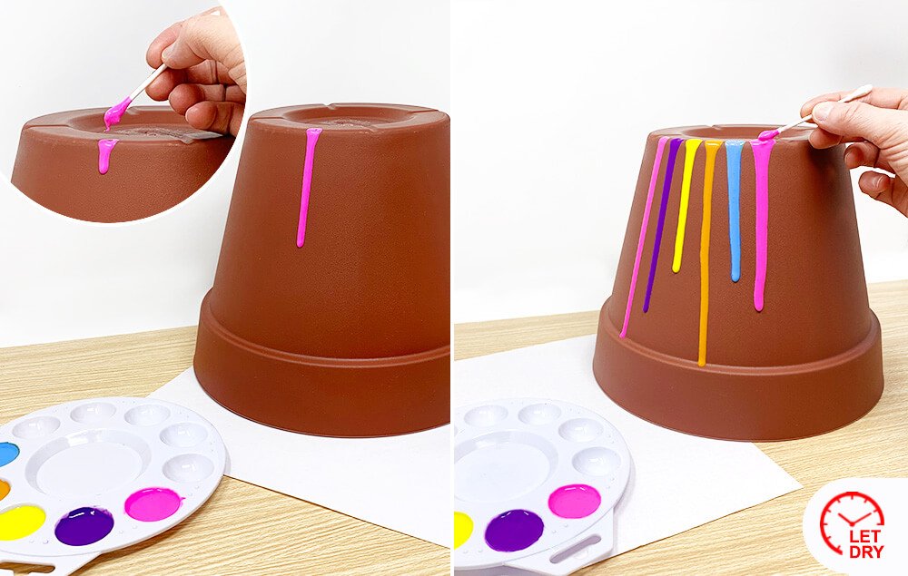 Apply enough paint to the pot so there is a bead of paint sitting on the edge. This bead will start rolling down the side. Tip: Paint trails will get longer over time as gravity does the work.